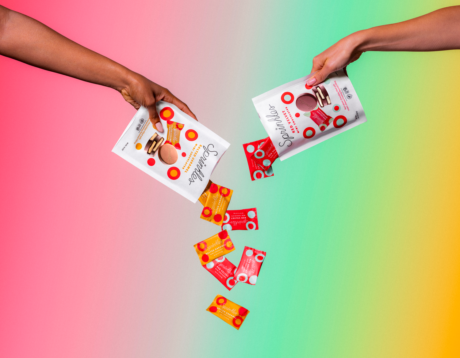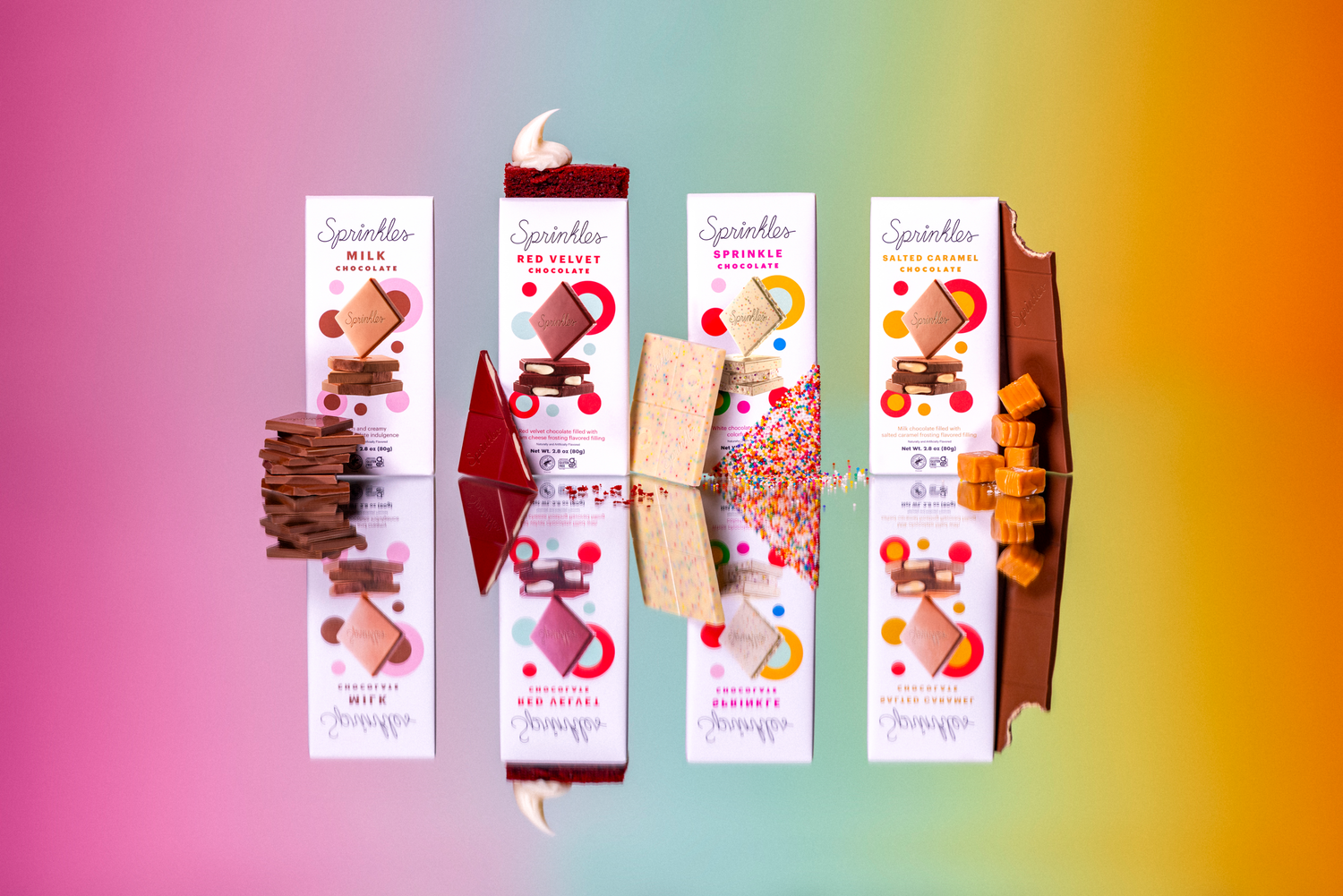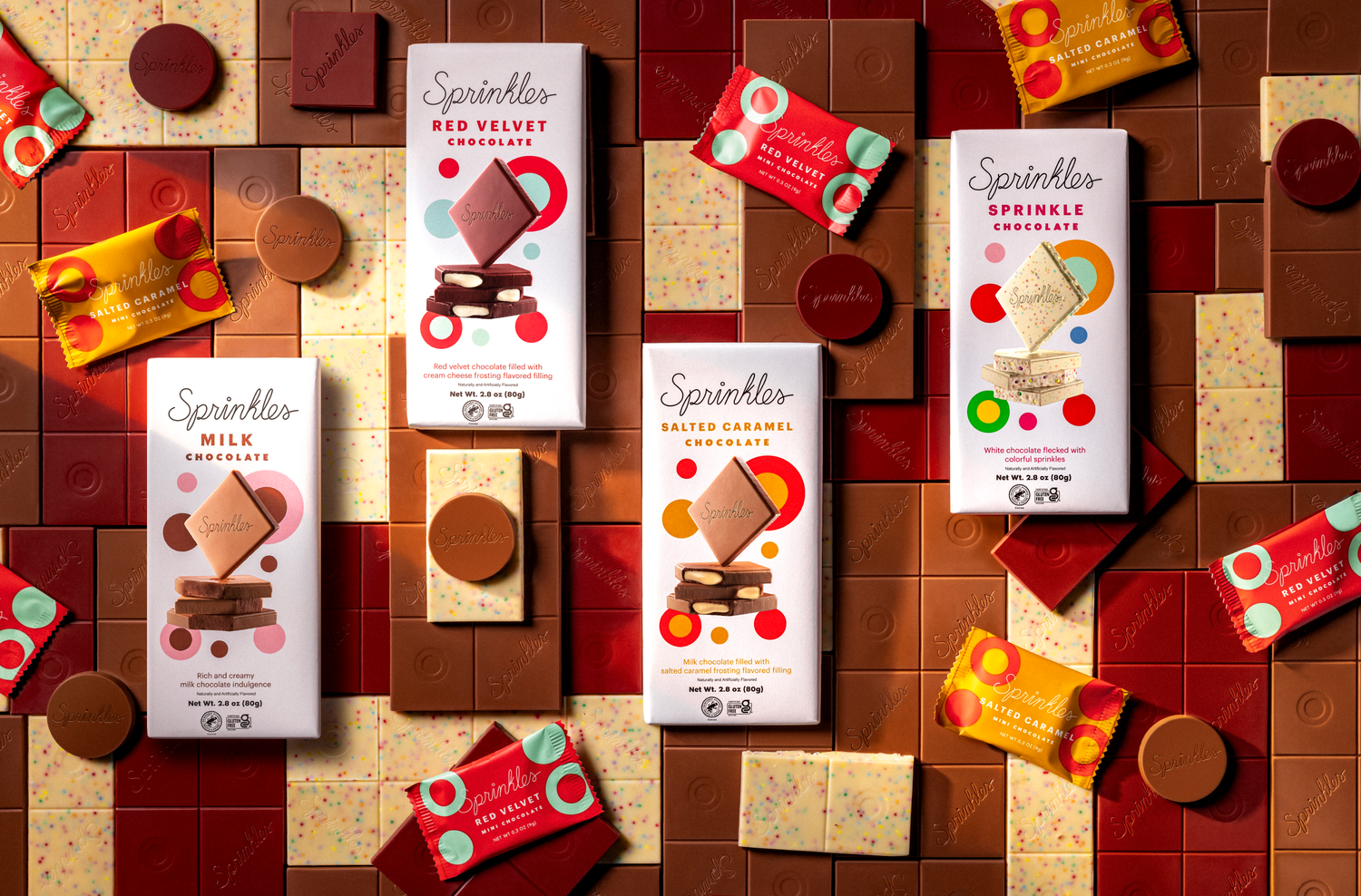 The Sprinkles Mini Chocolate Bites include Red Velvet and Salted Caramel. Embossed with the Sprinkles logo and its signature modern dot, the chocolate bars and the minis make for easy snacking and sharing.